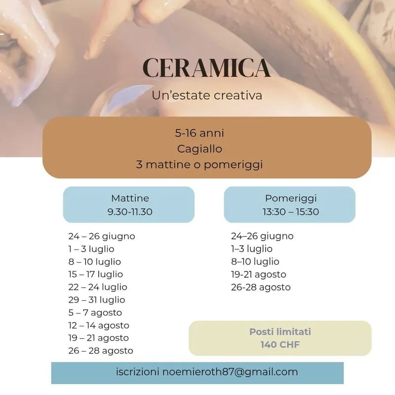 Scopri l'arte della ceramica in un'estate creativa a Cagiallo! 🌞 Questo laboratorio è un'opportunità unica per bambini e ragazzi dai 5 ai 16 anni di esplorare la loro creatività modellando l'argilla e creando opere uniche. I partecipanti avranno la possibilità di apprendere una nuova abilità, divertirsi e mettere le mani in pasta in un ambiente stimolante e accogliente. Ogni sessione è progettata per incoraggiare l'espressione individuale e la scoperta di nuove tecniche artistiche.
