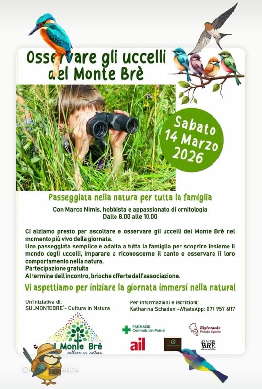 🌿 Una passeggiata nella natura alla scoperta degli uccelli del Monte Brè, sopra Lugano! Un'escursione pensata per tutta la famiglia, dove grandi e piccoli potranno osservare la fauna locale, riconoscere le specie più comuni e godersi il panorama mozzafiato sul lago e le montagne.