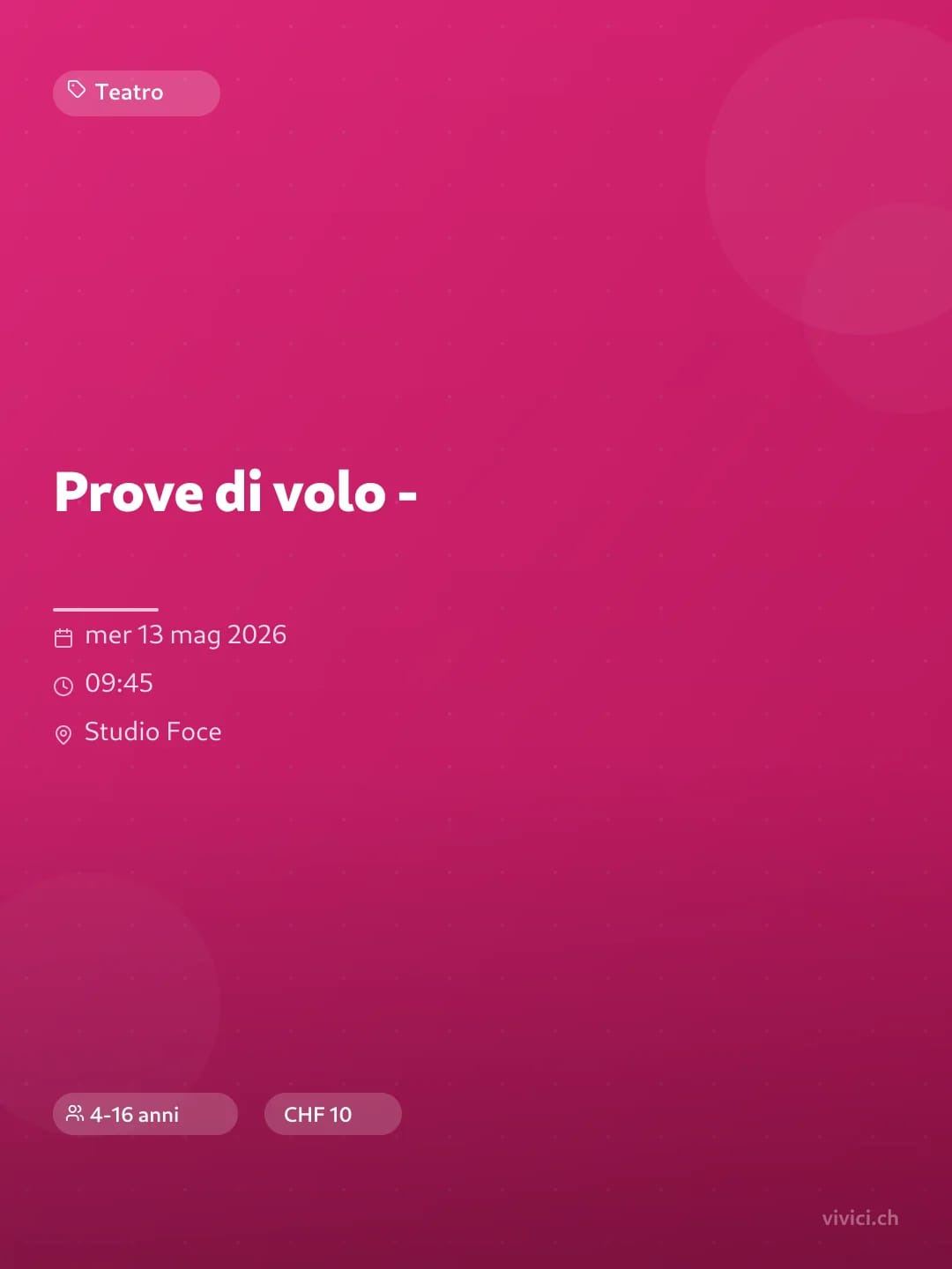 Un evento straordinario per i più piccoli, dove la magia del teatro incontra l'immaginazione! 🌟 "Prove di volo" è una performance coinvolgente che racconta la storia di un angelo caduto dal cielo, che si sente sperduto e desidera tornare nel suo mondo. Attraverso un viaggio di esplorazione, l'angelo scopre le meraviglie e le peculiarità della vita terrestre, affrontando con umorismo e curiosità le sfide del suo nuovo ambiente. Con una narrazione ricca di emozioni e tentativi, il pubblico sarà guidato in un'avventura che esplora il tema dell'accettazione e della