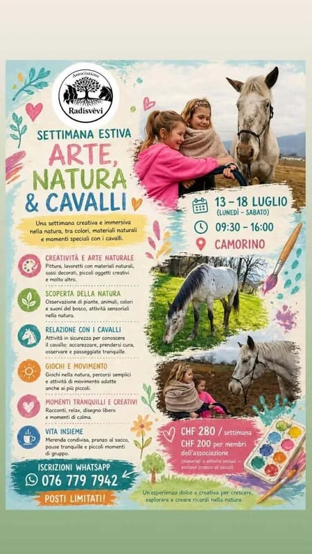 🐴🎨 Una settimana intera immersa nella natura, tra colori vivaci, materiali naturali e momenti speciali a contatto con i cavalli: è la Settimana Estiva Arte, Natura & Cavalli, organizzata dall'Associazione Radisvèvi a Camorino, nel cuore del Ticino. Un'esperienza creativa, sensoriale e dolcissima pensata per i bambini che amano esplorare il mondo con le mani, gli occhi e il cuore. Ogni giornata è un viaggio tra arte, scoperta della natura e la magia del contatto con questi splendidi animali. Un'occasione unica per crescere, esplorare e creare ricordi indimenticabili all'aria aperta.