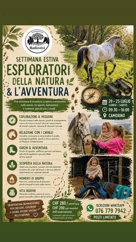 🌿🐴 Dal 20 al 25 luglio 2026, l'Associazione Radisvèvi organizza la Settimana Estiva Esploratori della Natura & l'Avventura a Camorino, in Ticino: sei giorni intensi e magici immersi nel verde, tra boschi, animali e avventure a cielo aperto. I bambini diventeranno veri esploratori, vivranno missioni emozionanti nella natura, stringeranno un legame autentico con i cavalli e torneranno a casa con ricordi indimenticabili. Un'esperienza pensata per crescere, scoprire, collaborare e divertirsi in modo sano e genuino, lontano dagli schermi e a contatto diretto con il mondo naturale.
