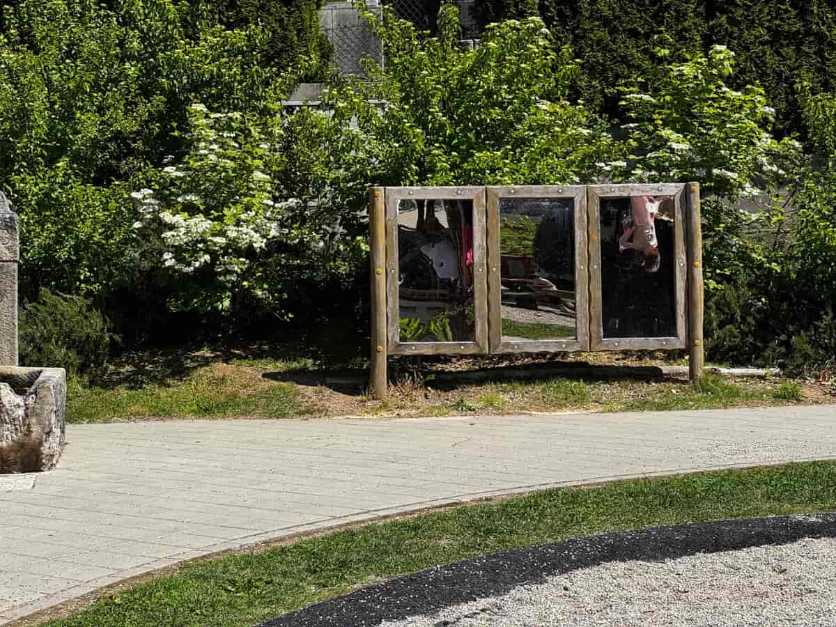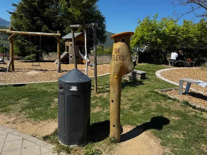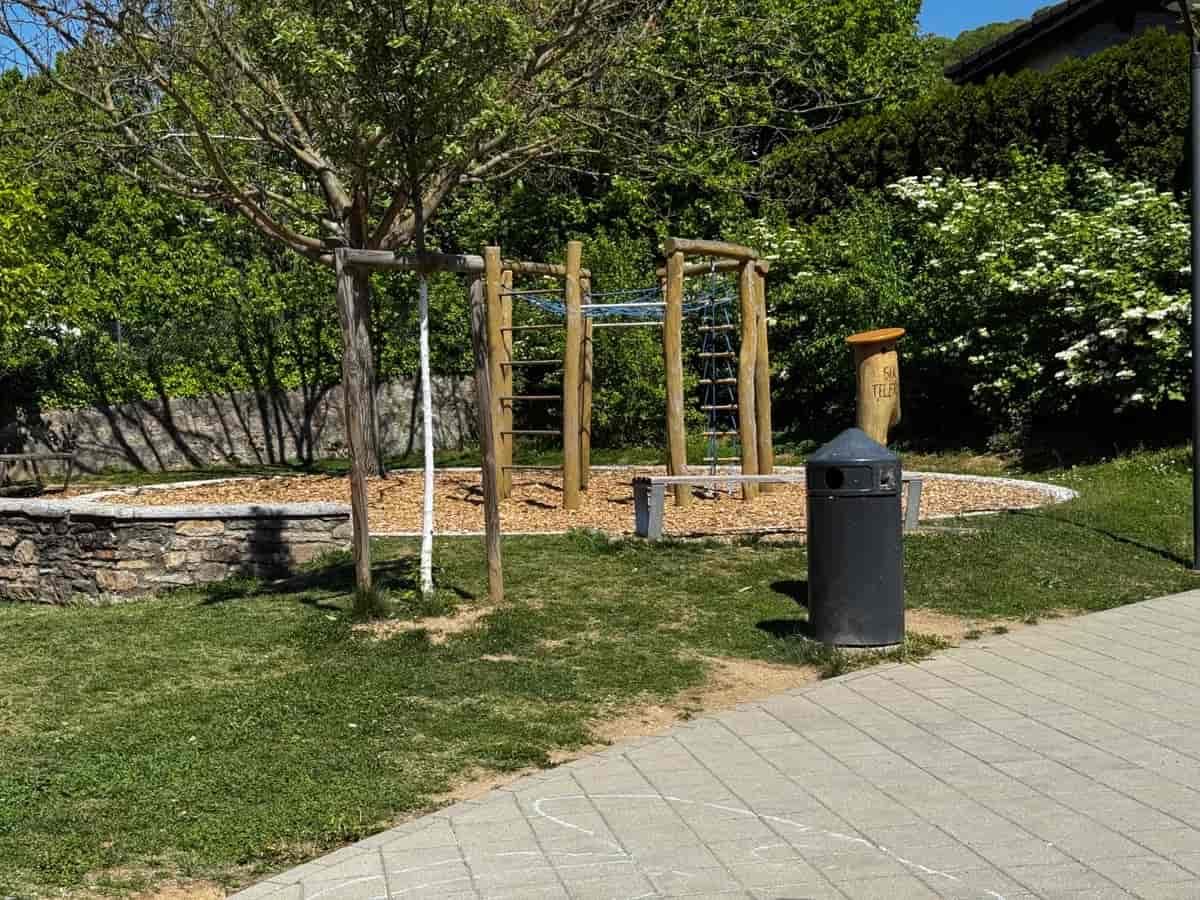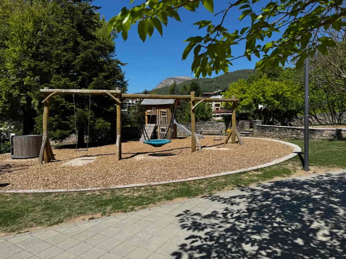 Un bellissimo parco giochi immerso nel verde con attrezzature in legno naturale e aree ombreggiate. Perfetto per bambini che amano giocare a contatto con la natura, circondati da alberi e con una splendida vista sulla montagna.